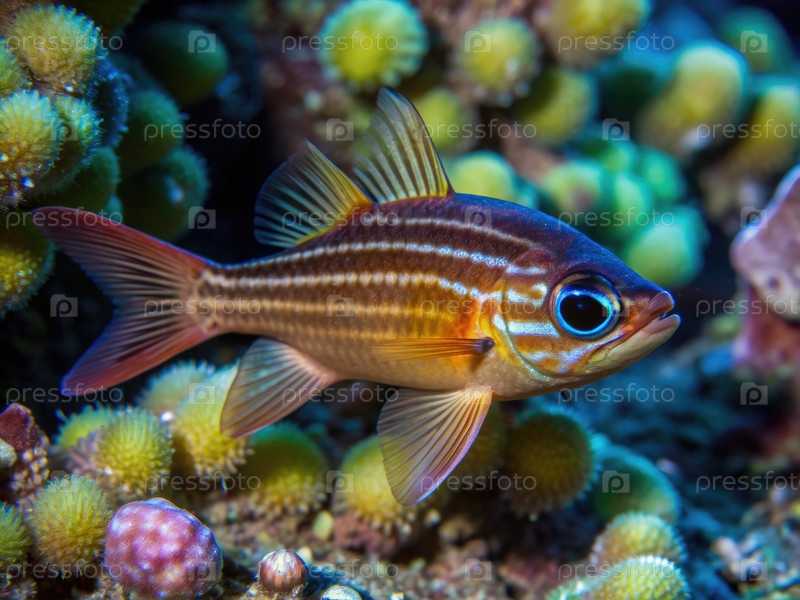 Четырехлопастная кардинальная рыбка плавает среди кораллов