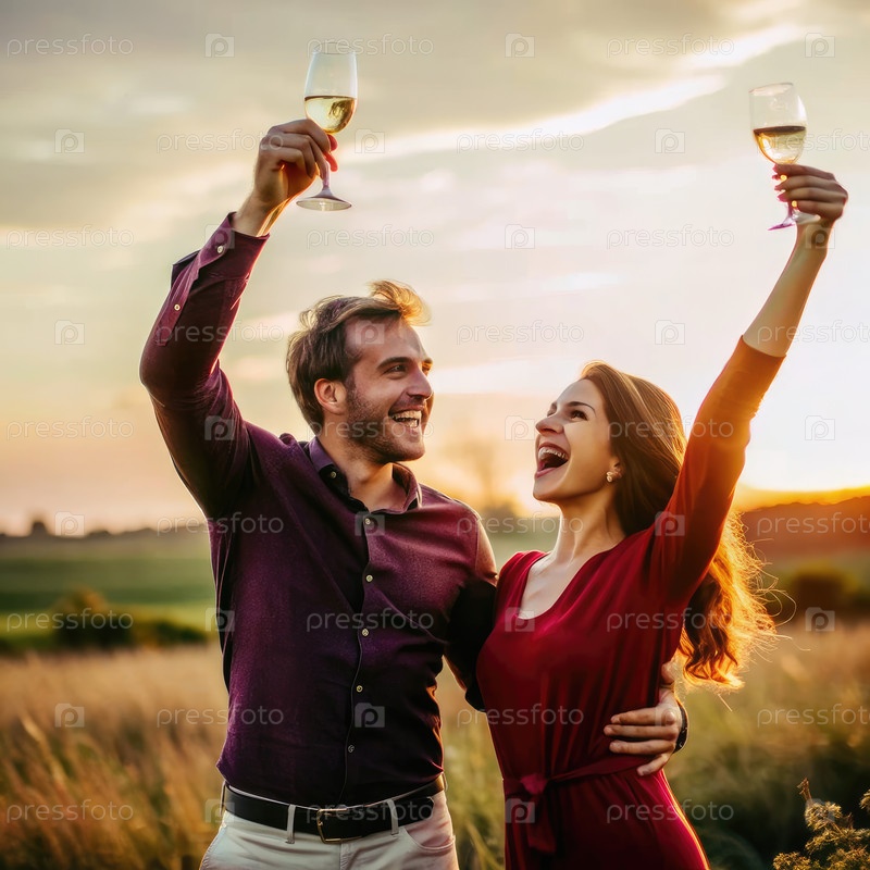 Счастливая пара радуется вином во время захода солнца на поле