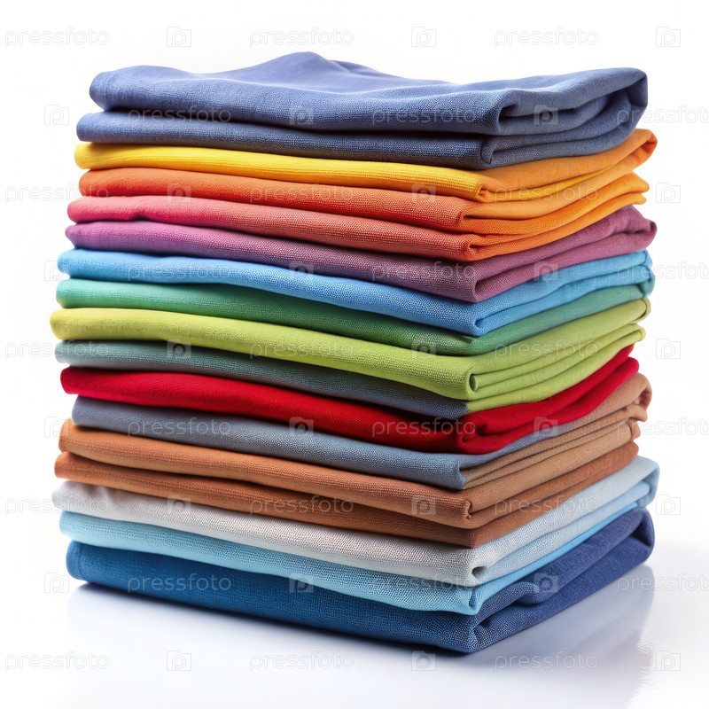 Стол с складываемыми футболками в различных цветах на белом фоне