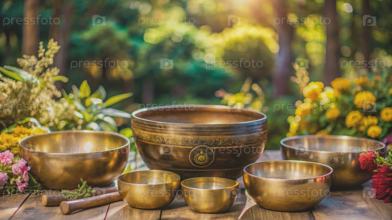 Набор украшенных пение миски, расположенные на деревянном столе в мирной наружной обстановке
