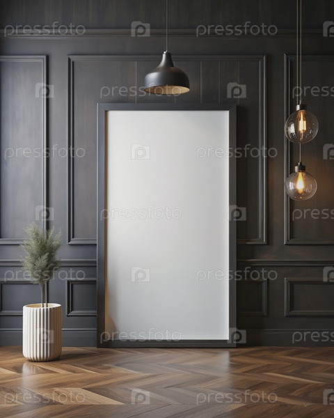 Белый плакат в черной раме против темной стены с висящими огнями