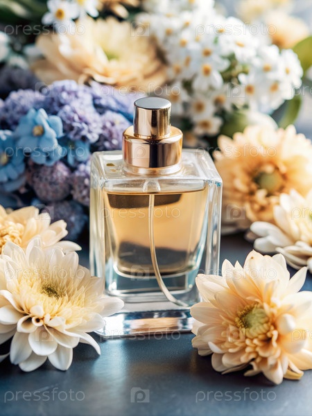 Прозрачная стеклянная бутылка с парфюмом, окруженная белыми и желтыми цветами