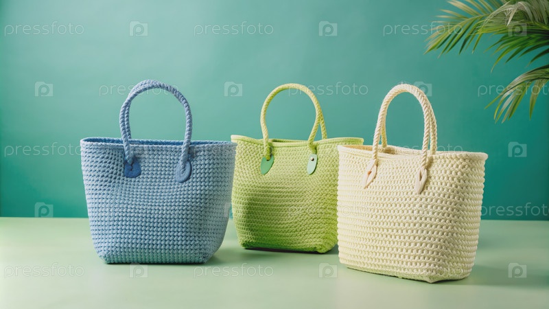 Три красочных сумки с джутовым тоте на зеленой поверхности