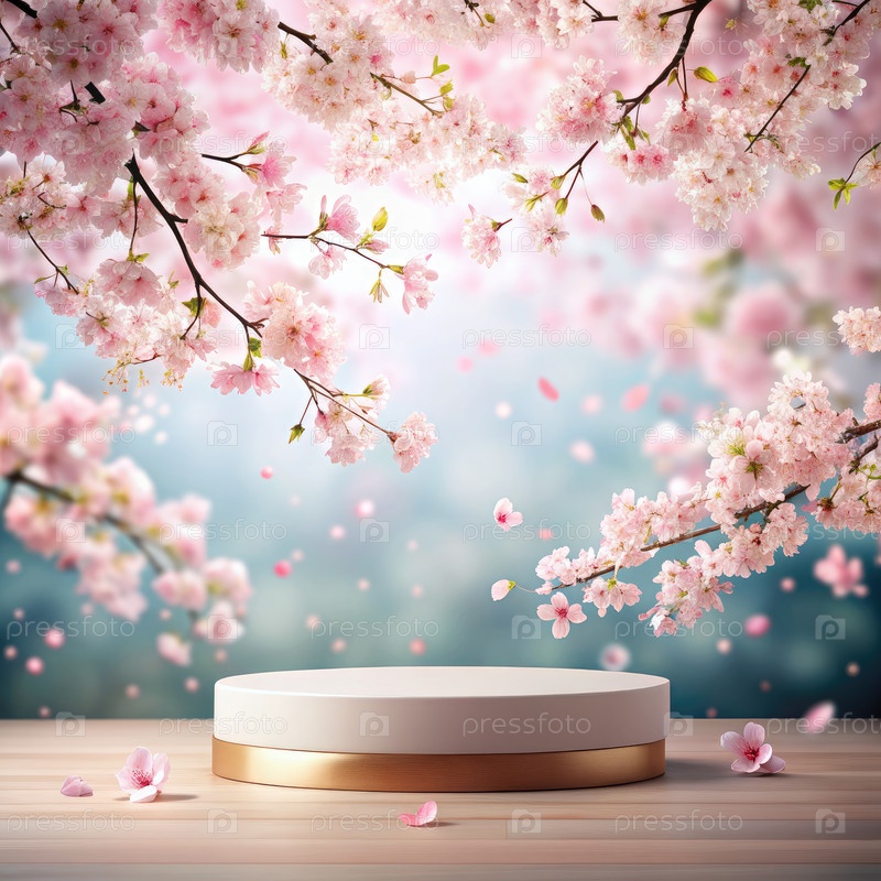 Белый подиум с цветами сакуры весной
