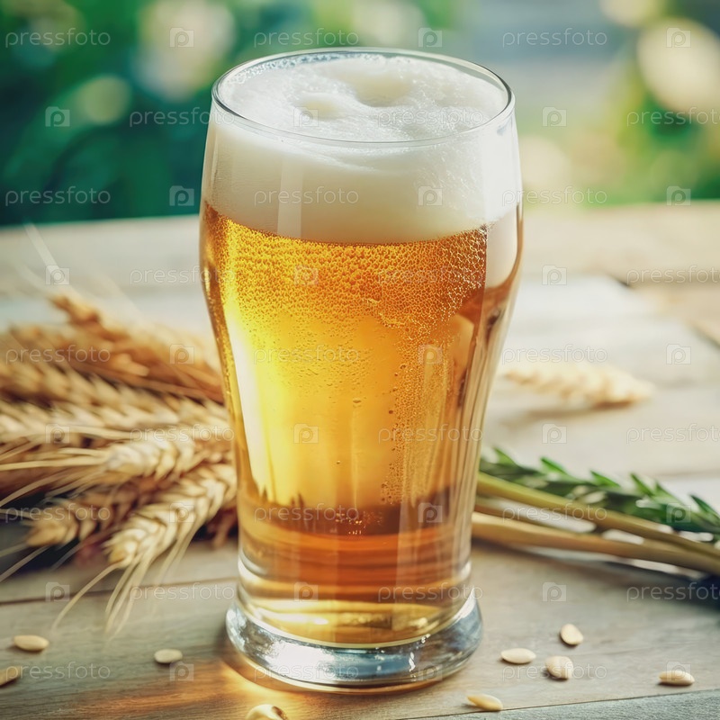 Освежающий стакан пива с пшеницей и розмарином на деревянном столе