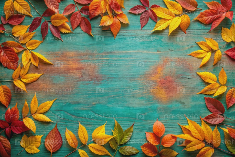 Осенние листья рамы на зеленом деревянном фоне. генеративный AI