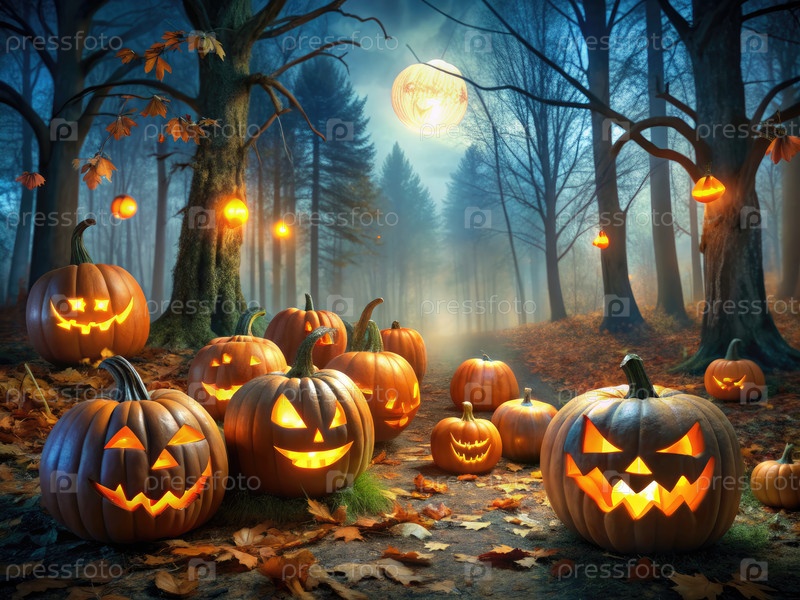 Вырезанные тыквы освещают лесную тропу в ночь Хэллоуина