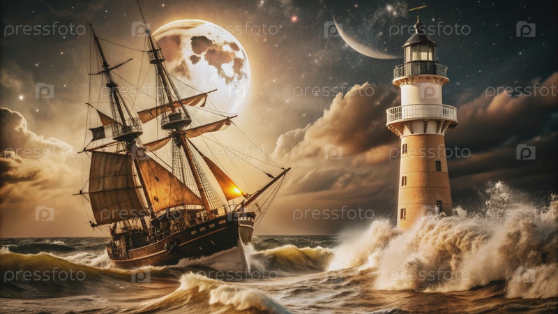Корабль борется с штормом под полнолунием и направляющим маяком