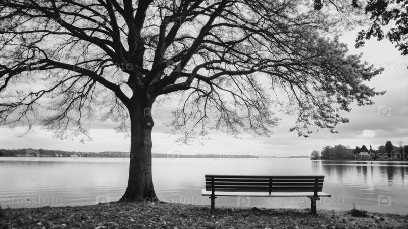 Одинокая скамейка под дубом у озера