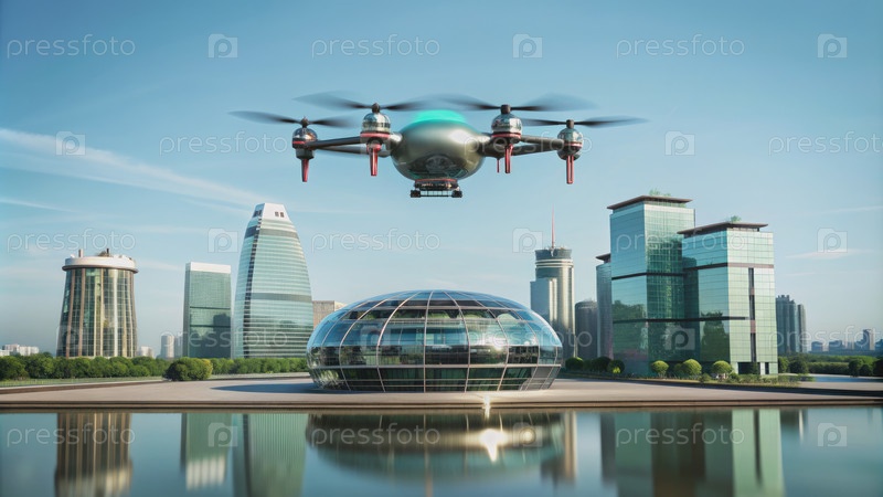 Дрон летает над городским ландшафтом со стеклянным зданием купола