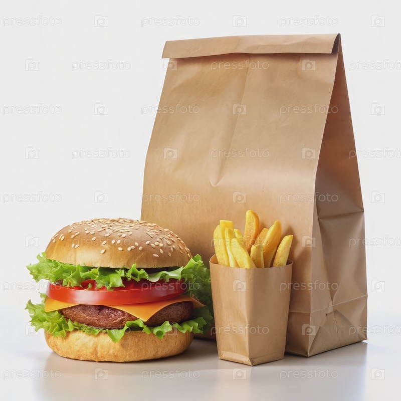 Классическое блюдо быстрого питания: гамбургер, картофель и бумажный пакет на белом фоне
