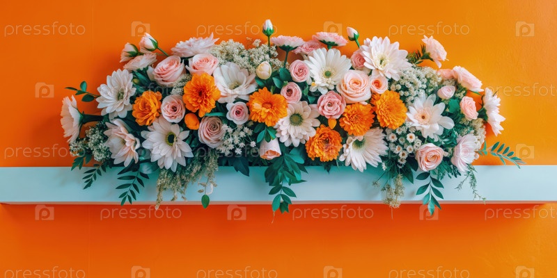 Большой букет розовых, белых и оранжевых цветов на синей полке против ярко-оранжевой стены