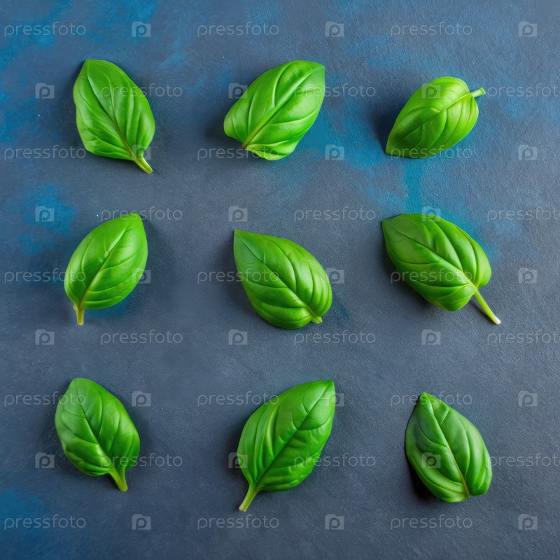 Девять зеленых листьев базилика изолированы на синем фоне