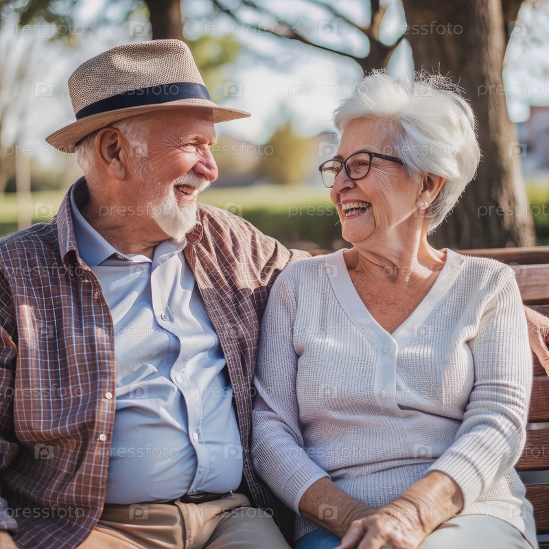 Пожилая пара делится смехом на скамейке в солнечном парке