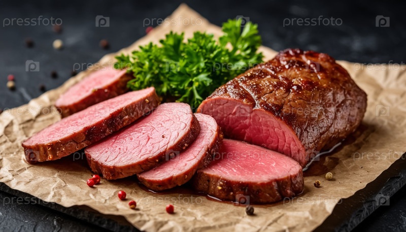 Гурманское блюдо из жареного мяса с травами на тарелке