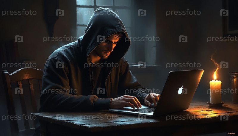 Анонимный хакер в толстовке с капюшоном использует ноутбук на темной сцене кибербезопасности
