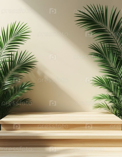 Natural Wood Display Stand с листьями тропических пальм для демонстрации продукта