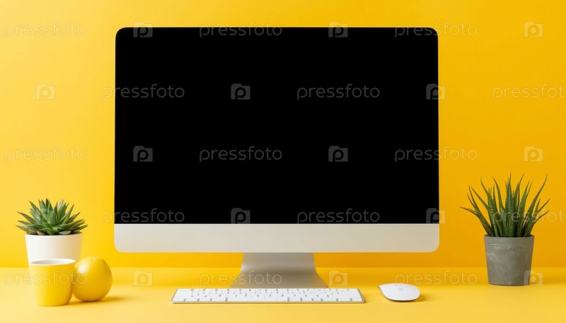 Компьютерный монитор клавиатуры и мыши на желтом фоне, современная установка рабочего пространства