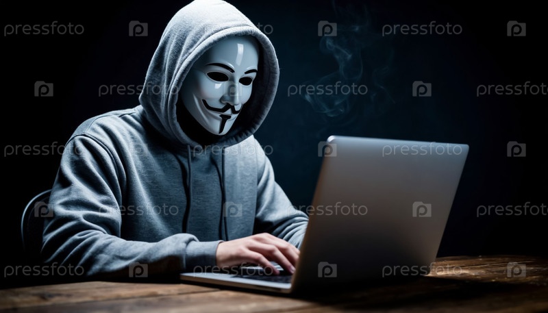 Темная комната с фигурой в капюшоне на ноутбуке, представляющей киберугрозы и взлом