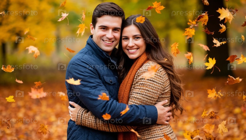 Романтическая осенняя объятия с парой и золотой падение листьев