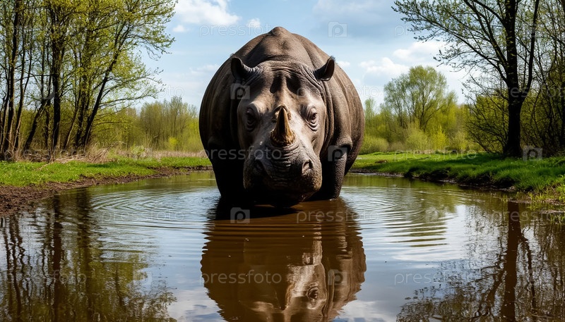 Большой носорог охлаждается в водяной дыре Африканский ландшафт печатный лист