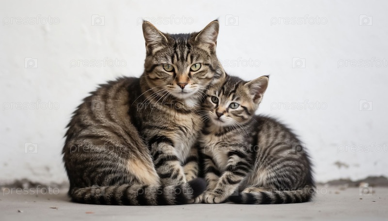 Одинокая мать Кошка и котенок сидят возле белой стены на улице