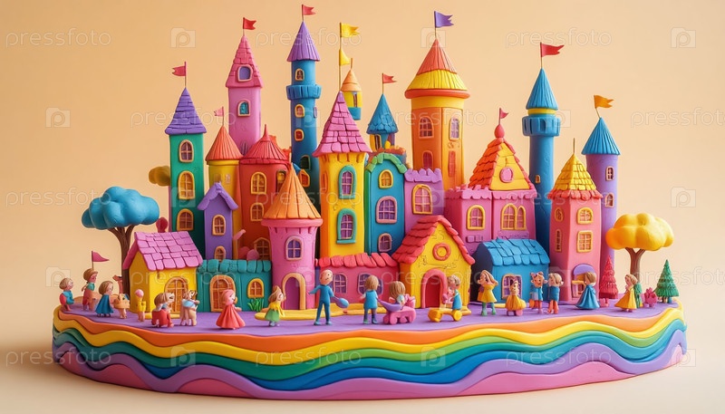 Детские пластиковые здания на простом бежевом фоне в стиле мультфильма