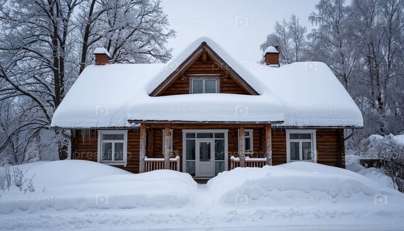 Снежная зимняя сцена с загородным домом, покрытым снегом