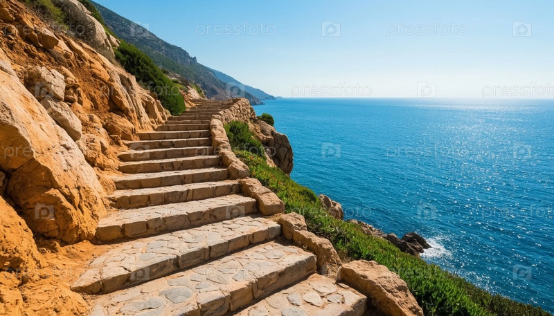 Каменные лестницы вдоль морского побережья Прибрежный ландшафт Скалистые ступеньки, ведущие к естественному океану