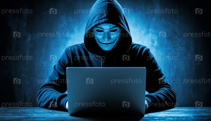 Кибер-вторжник в куртке, печатающий на ноутбуке при низком освещении Концепция нарушения безопасности