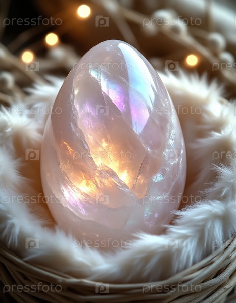 Декоративное мраморное яйцо в пушистых перьях Красочная страница Прозрачное кристаллическое яйцо с мягким оперением