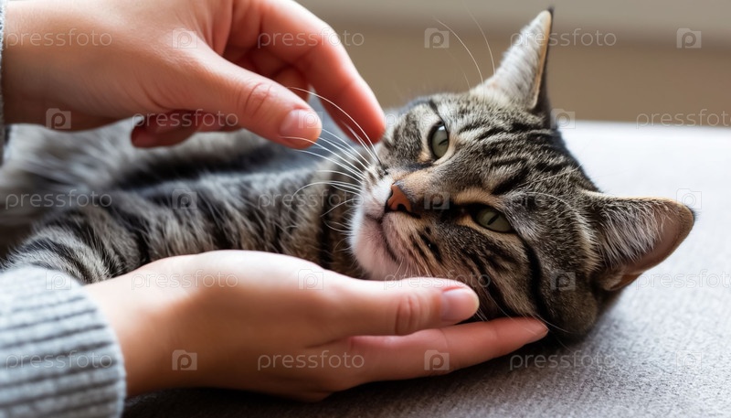 Владелец Hand Petting Happy Content Cat Closeup Человеческая связь с животными Владелец