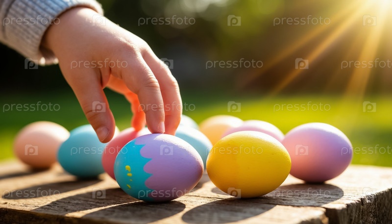 Детская рука, держащая пасхальные окрашенные яйца праздничное торжество