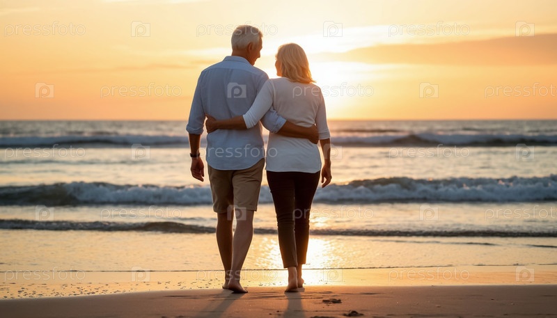 Счастливая пожилая пара вышла на пенсию Расслабляясь у моря в закате Золотой час Романтика