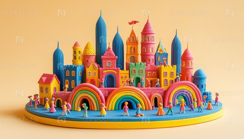 Мультфильмы Городские дома, сделанные из детского пластика на минималистическом бежевом фоне