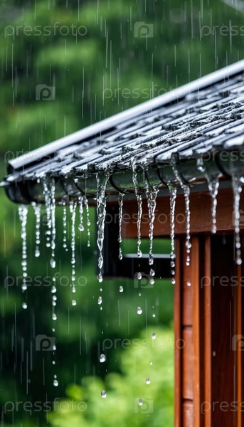Ближайшее изображение капель дождя, текущих по крыше в летний душ