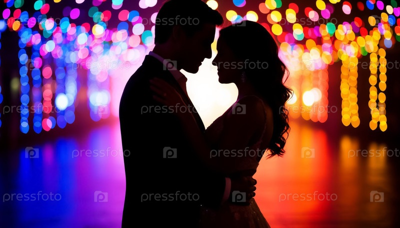 Романтическая пара танцует в ярких огнях боке, оформивших силуэт на праздничном фоне