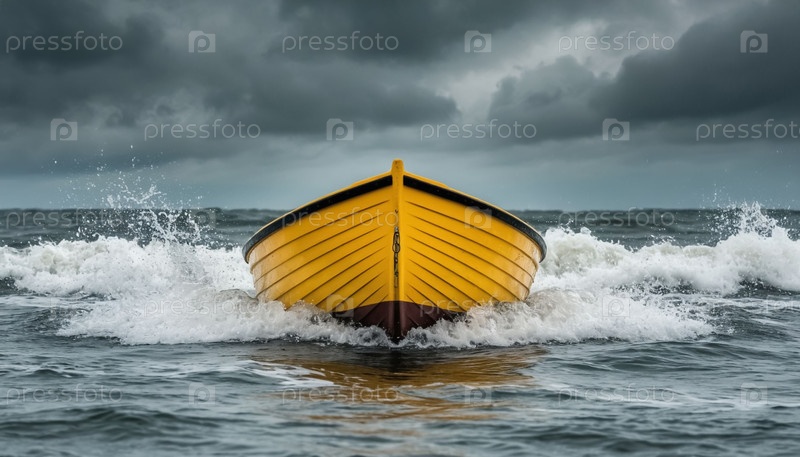 Заброшенная желтая лодка застряла на берегу после сильного шторма Moody Ocean Landscape