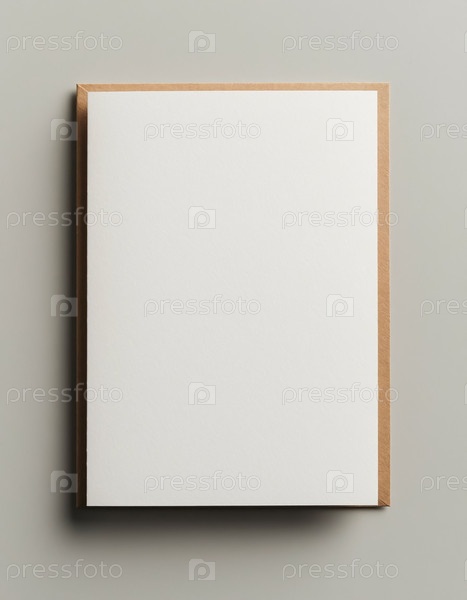 Белый пустой картонный макет для поздравительной карточки лежащий плоский на деревянной поверхности стола