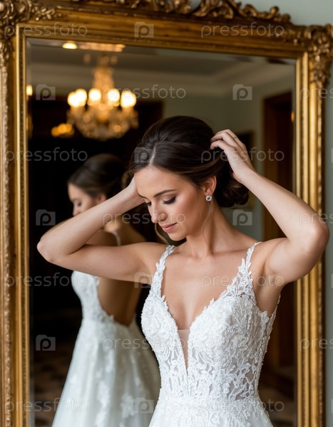 Невеста в свадебном платье Фиксация волос в зеркале Подготовка к церемонии