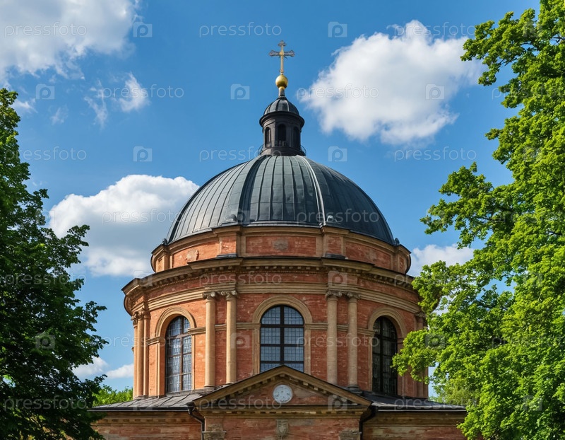 Часовня с Золотым крестом и куполом, окруженная пышным зеленым парком