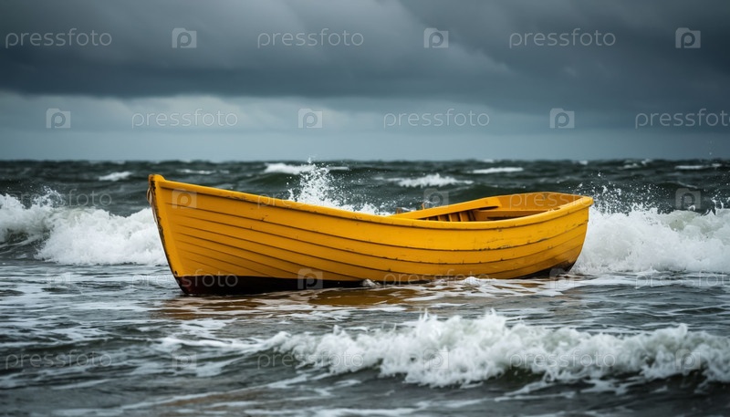 Одинокая желтая лодка вымыта на берег штормом в бурном море Драматическая пляжная сцена