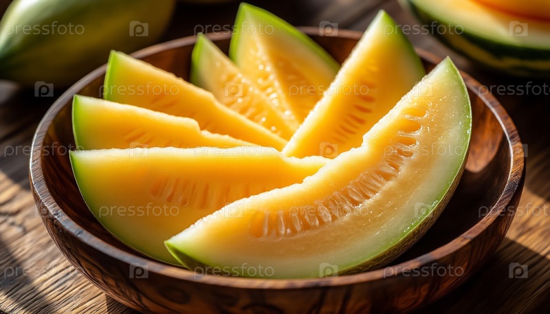 Зрелые кусочки дыни в деревянной миске на рустическом столе