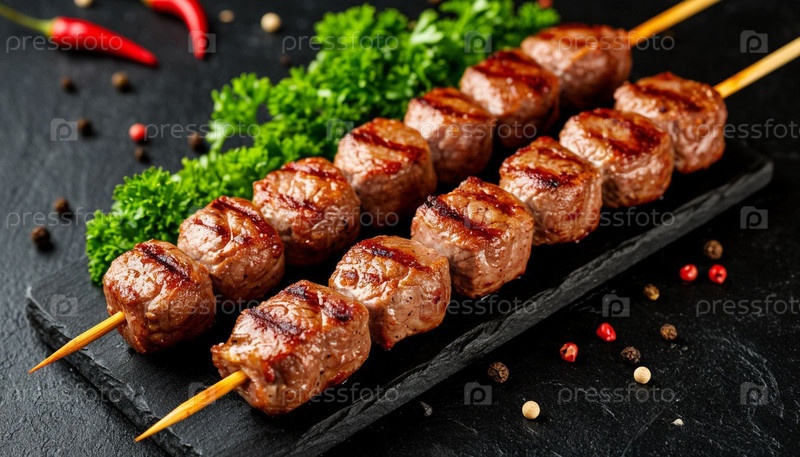 Grilled Shashlik on Skewer Coloring Page Темная поверхность стола с сочным мясом и обжаренными деталями