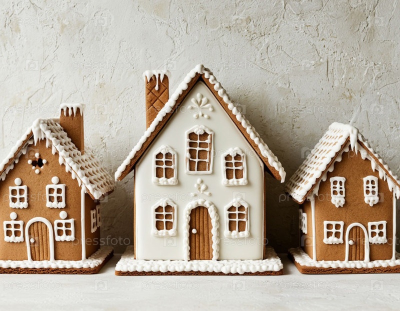 Имбирный хлеб съедобные дома на белом столе красочные страницы Sweet Christmas Bakery Scene with Decor