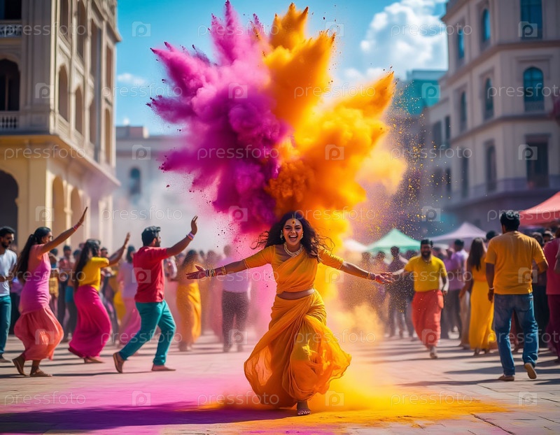 Традиционный индийский фестиваль Холи Красочный взрыв порошка Люди, одетые в национальное платье