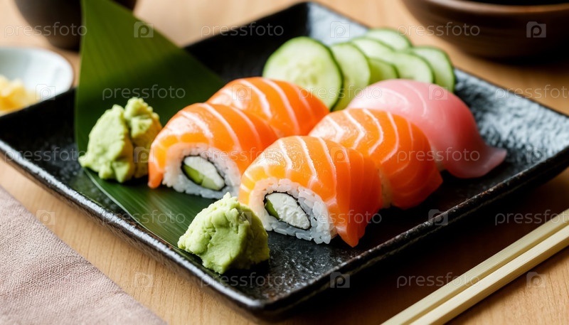 Традиционная японская кухня Суши-планшет на керамической тарелке с палочками для еды на минималистическом столе