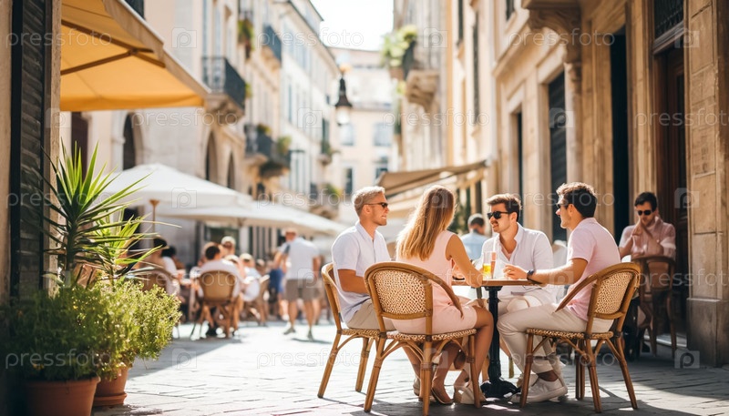 Летнее открытое кафе с столами и стульями Туристы отдыхают на старой улице европейского города