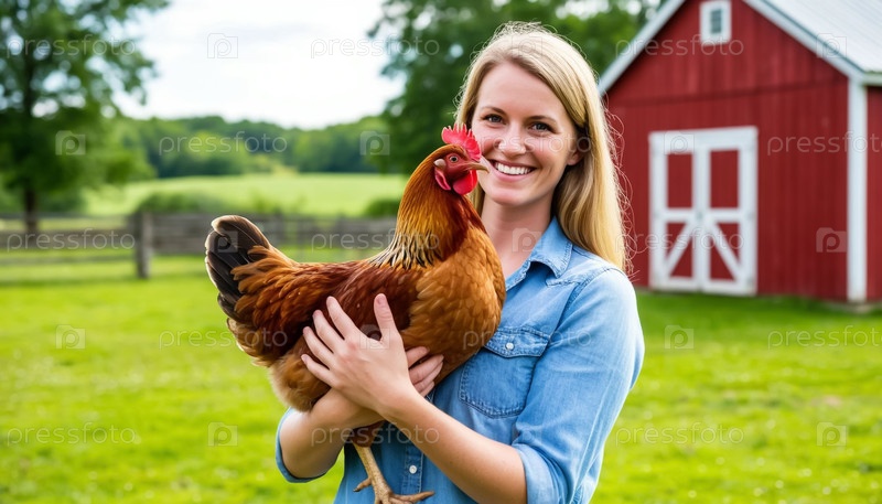 Фермер держит коричневую курицу с традиционным красным сараем на солнце