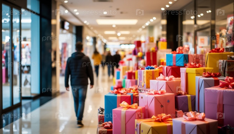 Gift Boxes Stacked in Foreground of Busy Shopping Mall Blurred Stores and Shoppers Background